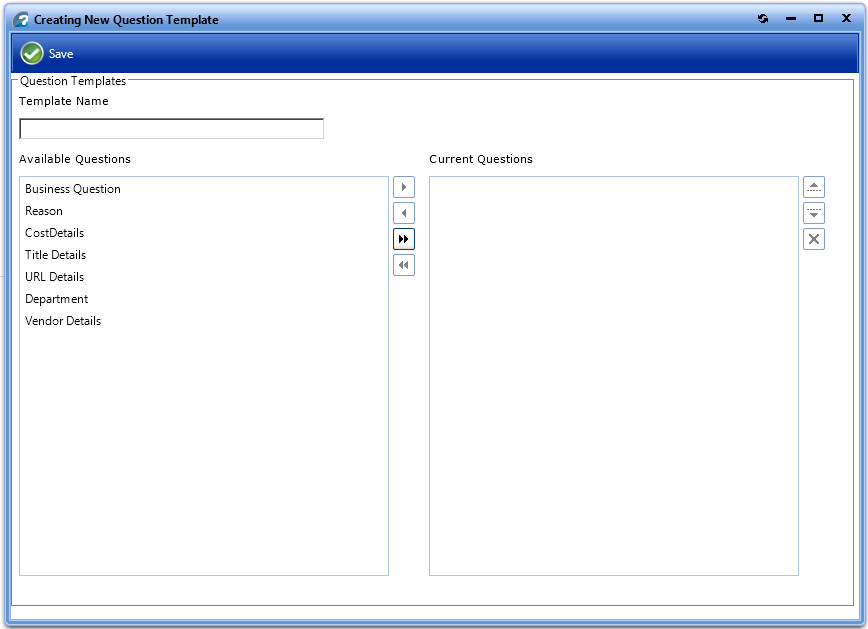 5. In the Available Questions list, select Reason and click the right arrow button to move it to the Current Questions list.