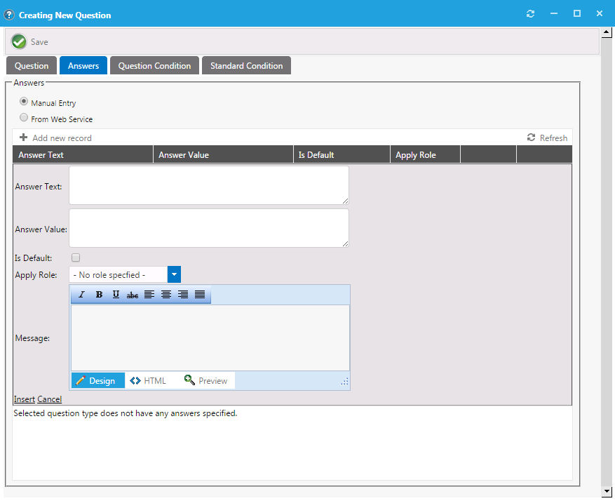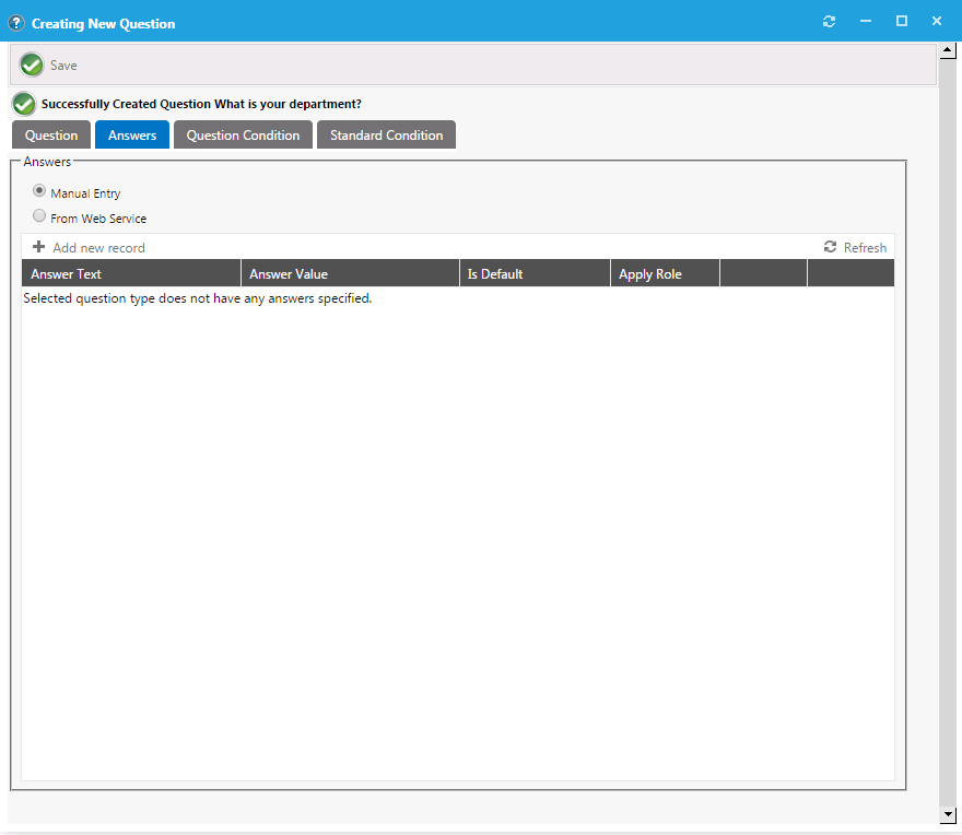 18. Click Save. You are notified that the question was created successfully, and, because you selected Dropdown List as the question format, the Answers tab is enabled, where you need to enter the values for the list.